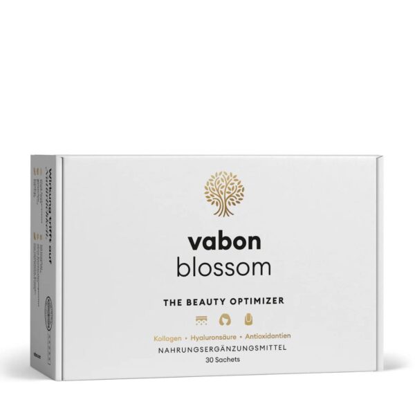 BLOSSOM – THE BEAUTY OPTIMIZER von VABO-N ist ein Nahrungsergänzungsmittel mit Kollagenpeptiden, Hyaluronsäure, Pflanzenstoffen, Antioxidantien, Vitaminen, Mineralstoffen und mit Süßungsmitteln.