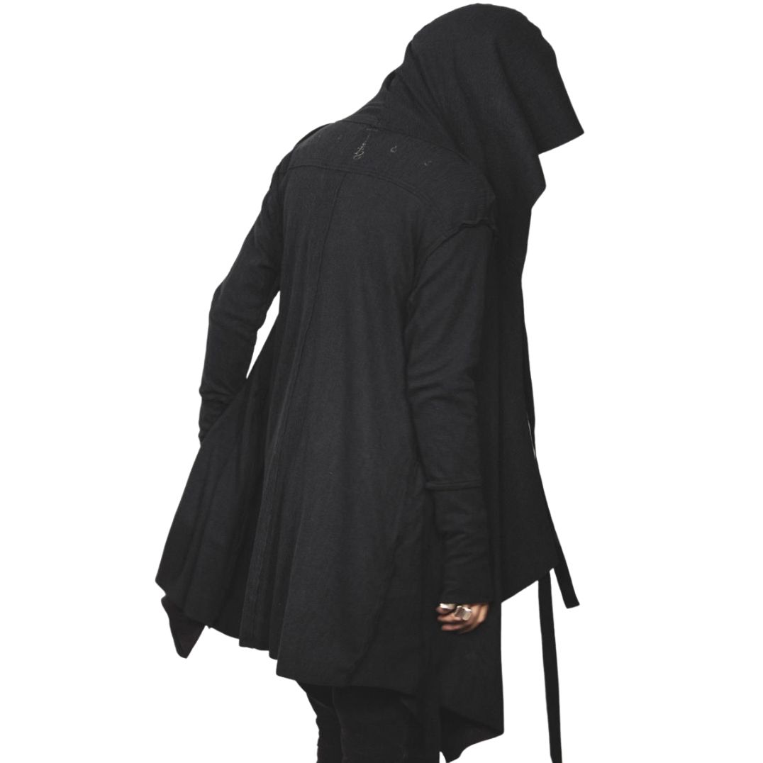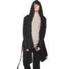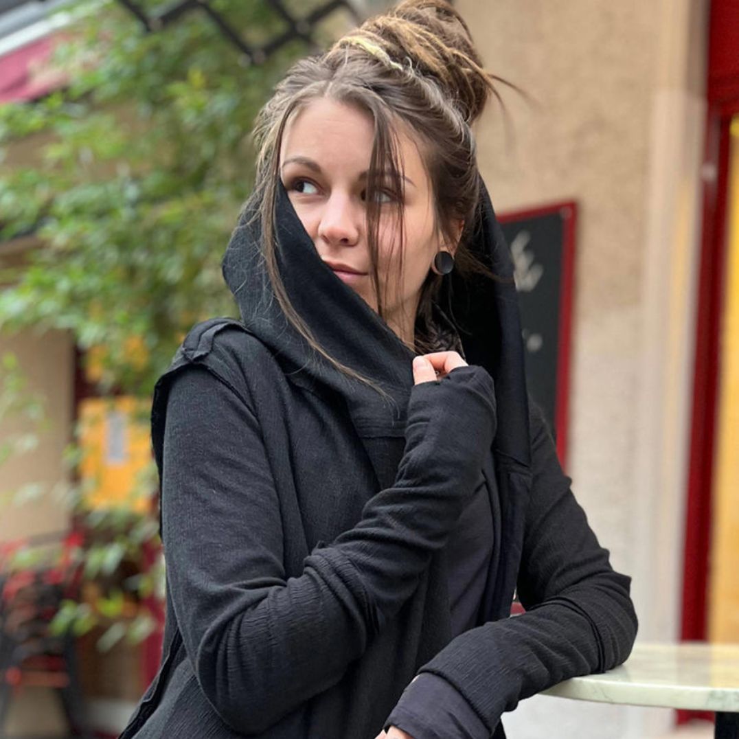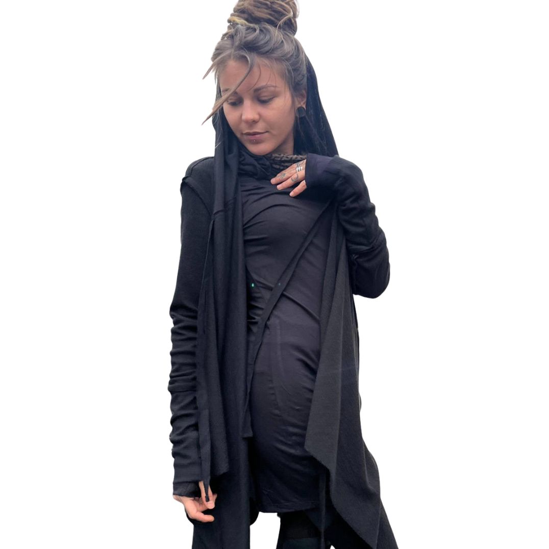 Cardigan „Crime“ Black – die Schönheit der Einfachheit – eine faszinierende Ausdrucksweise. Und genau das verkörpert dieser Crime-Cardigan. Mit seinem superweichen Stoff umhüllt er deinen Körper mit perfektem Komfort – ganz gleich, was du darunter trägst. Trage ihn so, wie du möchtest, und das Crime-Design erledigt den Rest für dich. Einfach zu tragen und zu kombinieren, egal zu welchem Outfit. Offen, geschlossen oder als Schal. Dieses Teil rundet deinen dunklen Fashion-Look ab, egal ob Männlein, Weiblein oder Alien – Unisex ist der beste Sex. Eine Kopfbedeckung im Mönchsstil mit feinen Einschnitten rundum, die dir einen einzigartigen Look für Ihr nächstes Abenteuer verleiht. Ein magischer mittelalterlicher Umhang, der „Willkommen in der Zukunft“ ruft.