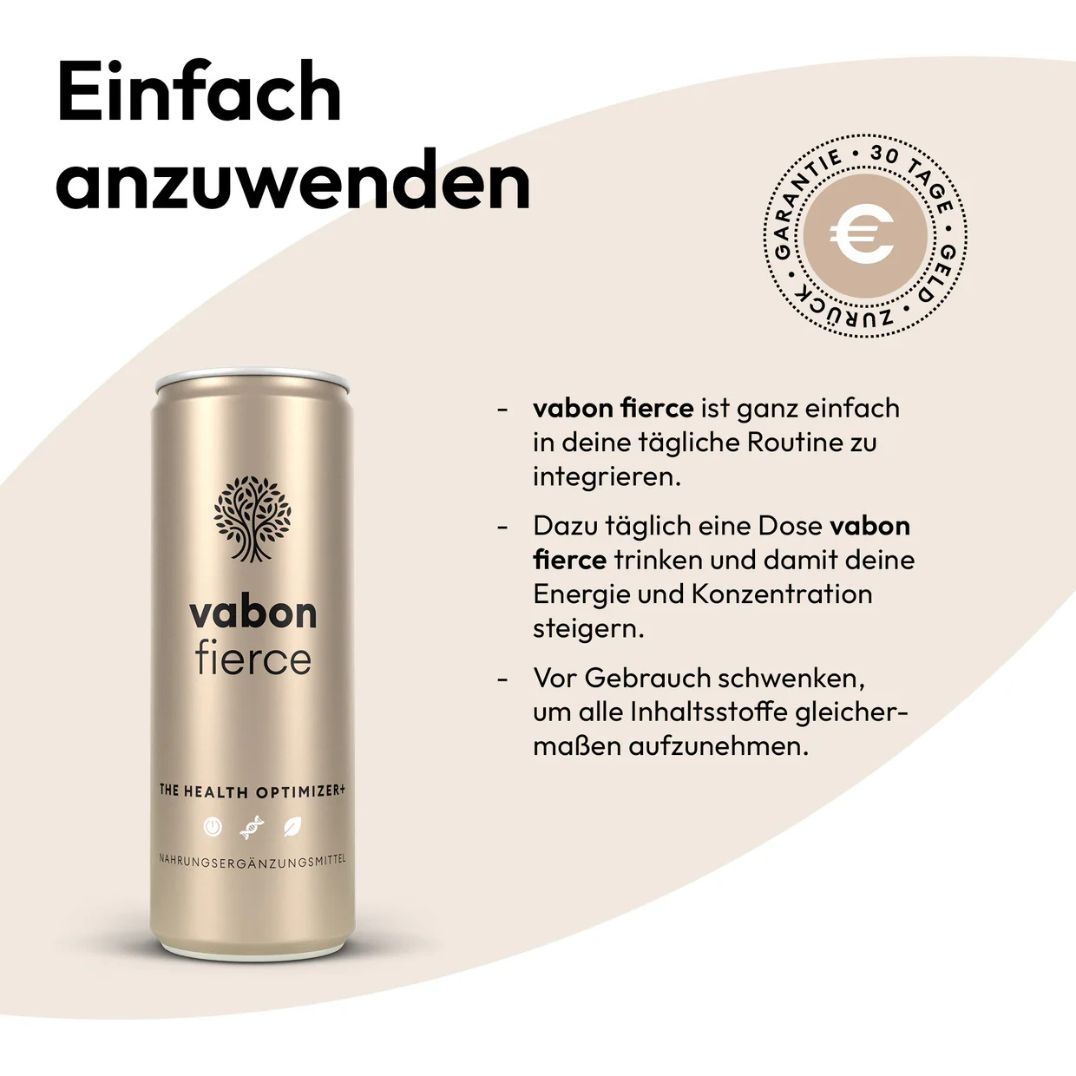 Genieße täglich eine Dose vabon fierce um deine Energie und Konzentration zu steigern. Perfekt für einen schwungvollen Start in den Tag oder gegen das Nachmittagstief. Abends empfehlen wir koffeinsensiblen Menschen die Einnahme nicht mehr.