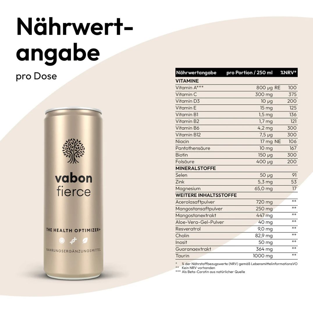 1-pack vabon fierce enthält 24 Dosen zu je 250 ml. Empfohlene Tagesdosis: 1 Dose á 250 ml