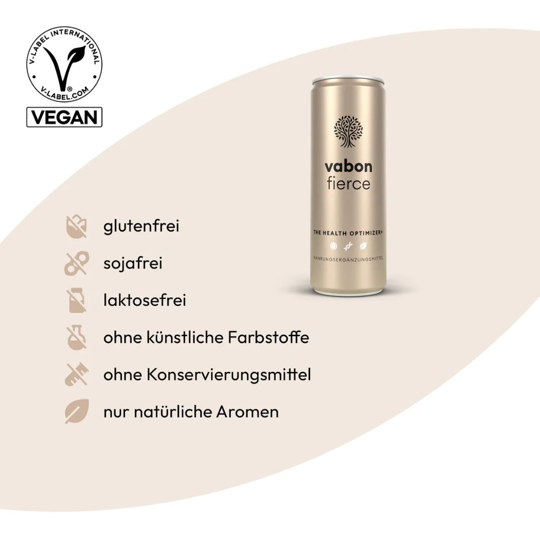 vabon fierce enthält nur natürliche Aromen, verzichtet auf künstliche Farbstoffe, ist vegan sowie frei von Soja, Laktose und Gluten. Es ist auf der Kölner Liste verzeichnet, was höchste Qualität und Sicherheit für Athleten gewährleistet.