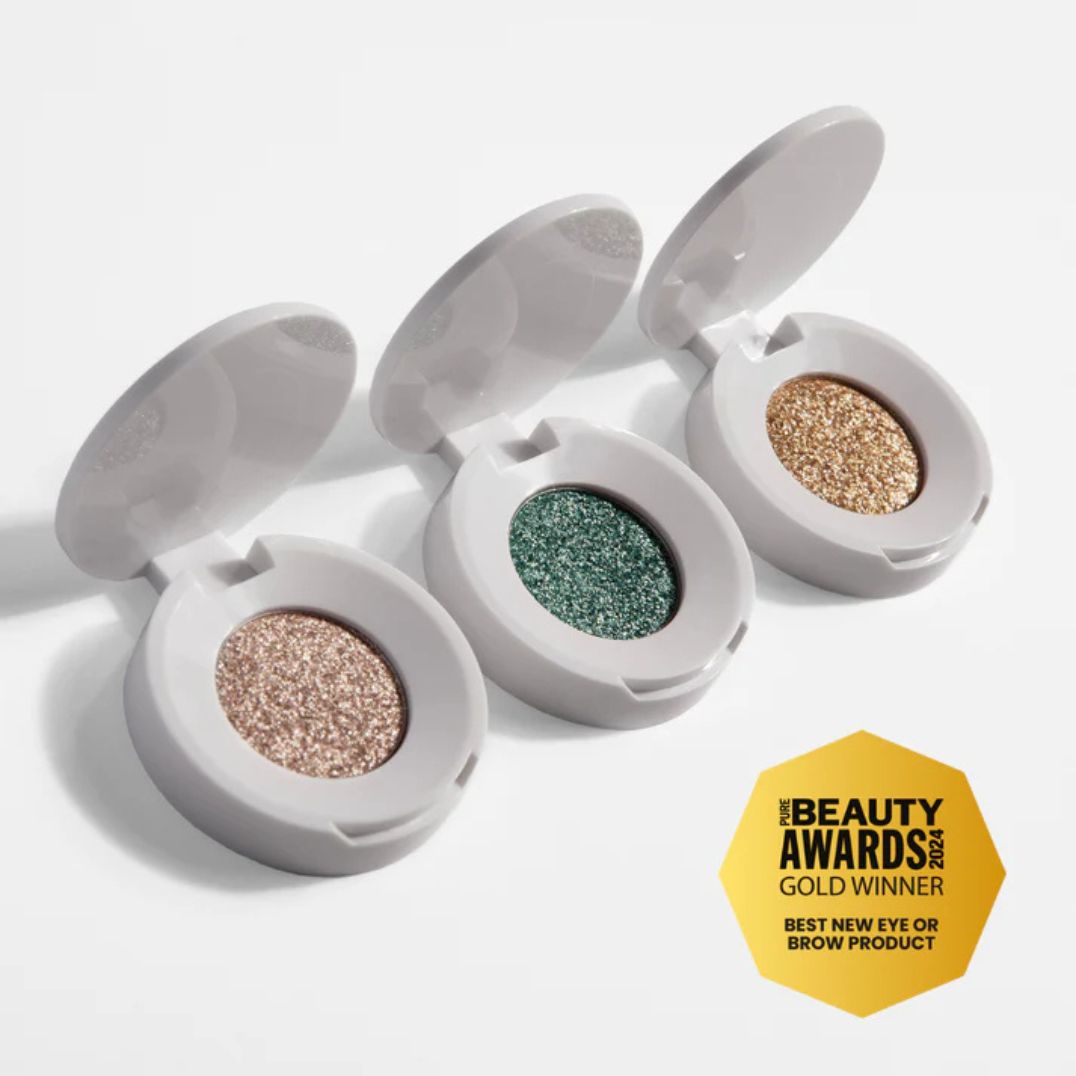 Das Glitzerlidschatten „Set Anam“ enthält alle drei biologisch abbaubaren Glitter Eyeshadows von Anam Cosmetics in den Farben Teal, Taupe und Gold.