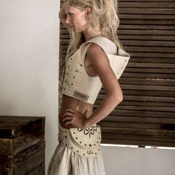 Der Verschluss dieser Gürteltasche besteht aus einer dekorativen Reihe von Druckknöpfen, wodurch sie auch größenverstellbar ist. Mit einem beeindruckenden, massiven Messingdrachen auf der Rückseite und heiliger Geometrie auf der Vorderseite hat diese Hüfttasche sowohl boho-chic, aber auch einen orientalischen Touch.