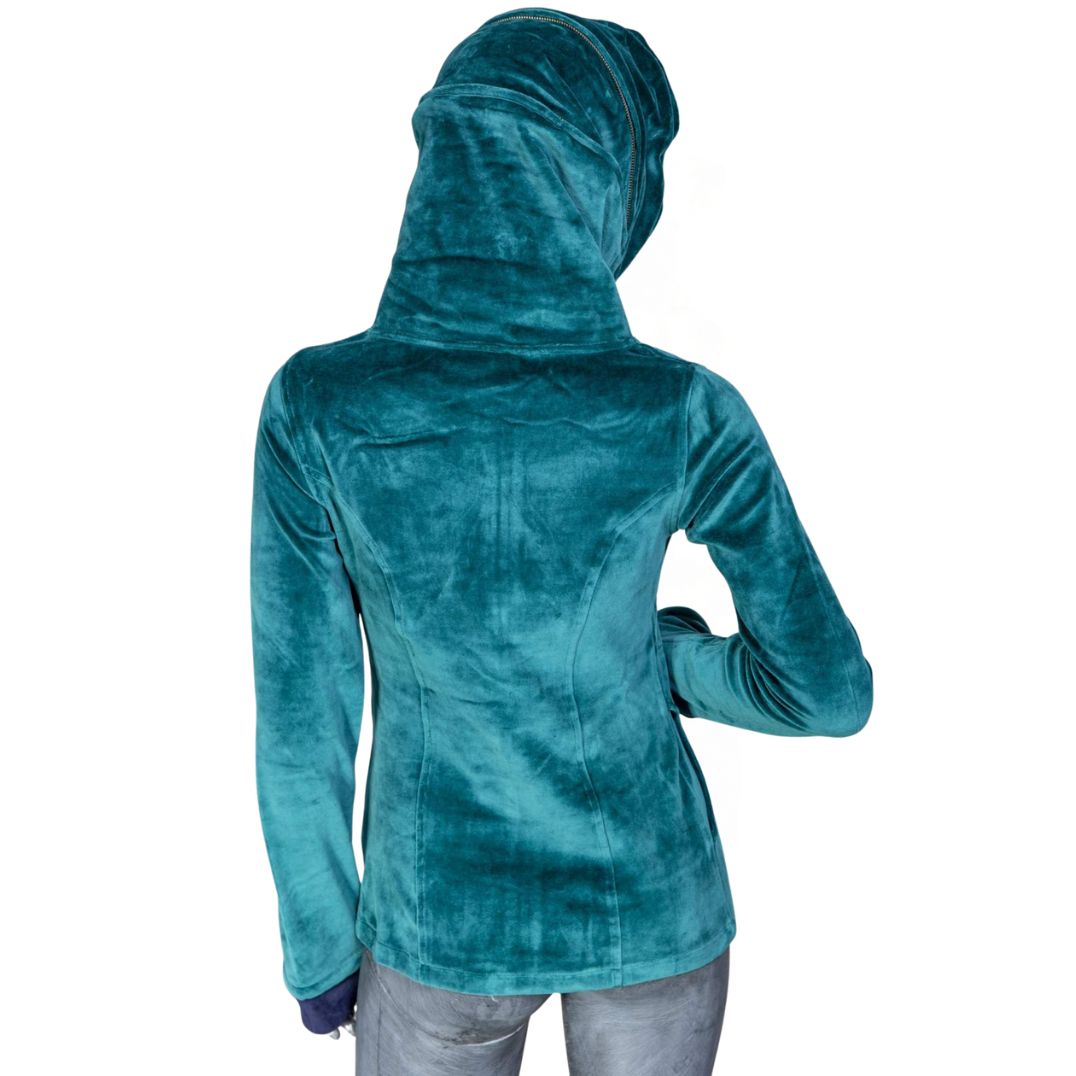 Die Jacke JESSY aus Bio Samt ist tailliert, hat eine 2 in 1- Kapuze mit Reißverschluss und Kordel (wandelbar zum Schalkragen), Reißverschluss in der vorderen Mitte,