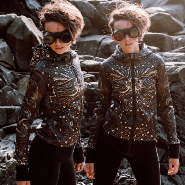 Psychedelischer Damen-Hoodie mit Reißverschluss und einzigartigem, hochwertigem Druck des visionären Künstlers Luminokaya aus weicher Mikrofaser „Soft Touch“ von Equilibrium Clothing.