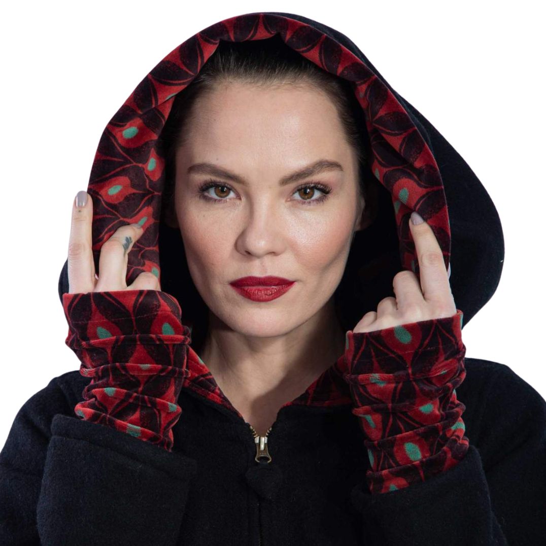 Der schöne Kurzmantel „Malia“ Black aus recycelter Wolle ist gefüttert mit Bio-Baumwolle hat einen taillierten Schnitt in romantischer, eleganter A-Linien Form, seitliche Halbmond Taschen und geraffte, verspielte Stulpen mit Daumenloch. Die große Arwenkapuze á la Chapati Design ist einfach märchenhaft und du kannst sie auch als gemütlicher Schalkragen tragen.