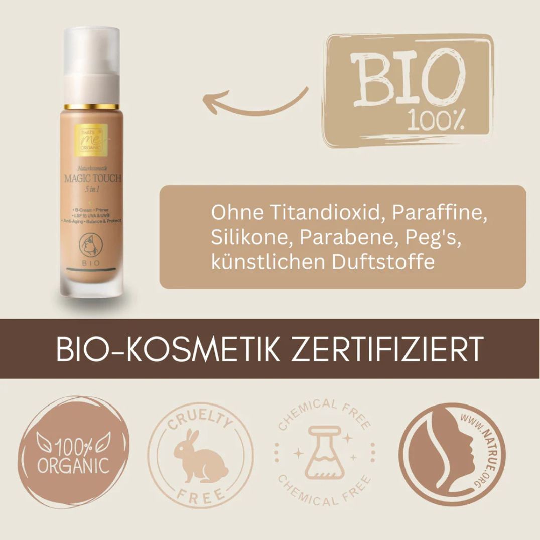 Zertifiziert durch NATRUE als echtes Bio-Produkt und hergestellt mit natürlichen Pigmenten, glättet Magic Touch das Hautbild und kaschiert kleine Unvollkommenheiten. Die schützende und abdeckende Wirkung macht eine zusätzliche Grundierung überflüssig.