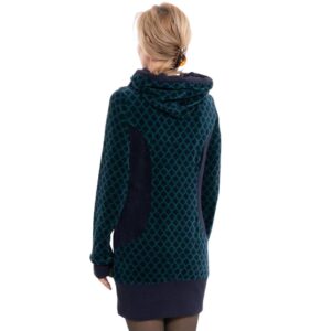 Die Jacke JESSY aus Merinowolle ist tailliert, hat eine 2 in 1- Kapuze mit Reißverschluss und Kordel (wandelbar zum Schalkragen), Reißverschluss in der vorderen Mitte,