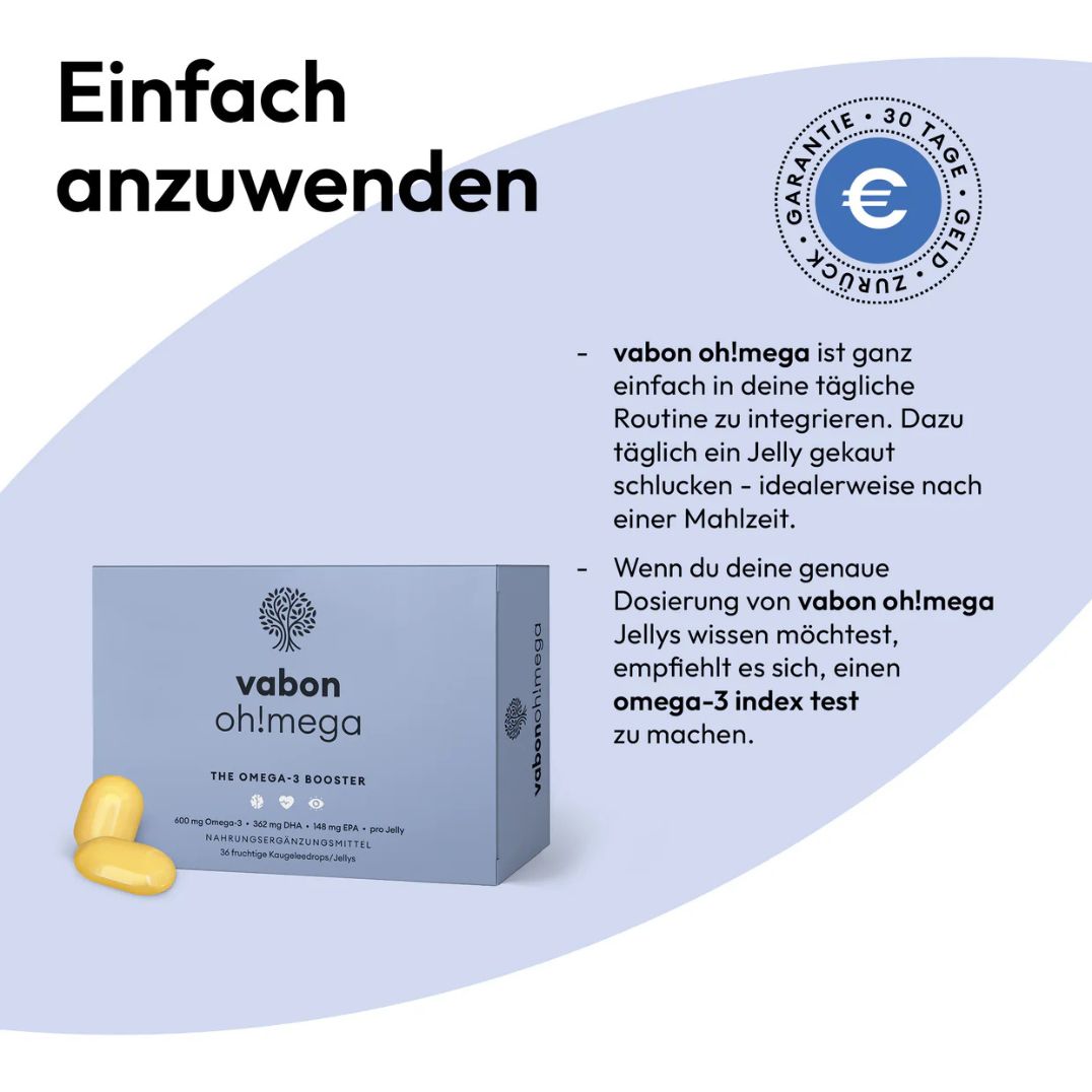 vabon oh!mega, gekaut schlucken, idealerweise nach einer Mahlzeit. Unsere vabon oh!mega Jellys können ohne Wasser eingenommen werden und haben einen angenehm leckeren Geschmack, den auch Kinder lieben. Es ist sehr leicht transportierbar und zuckerfrei.