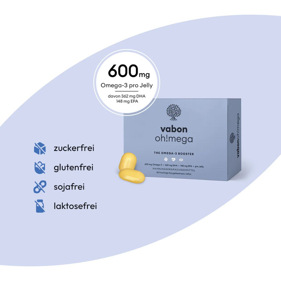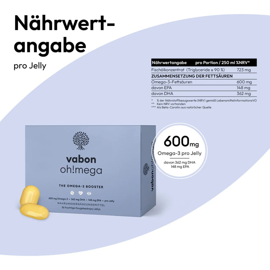 • OH!MEGA – OMEGA-3 BOOSTER von VABO-N ist ein super leckeres, hochdosiertes Omega-3-Produkt. Es enthält hochwertiges Fischölkonzentrat (>90% Triglyceride) mit 600 mg Omega- 3 Fettsäuren, davon 362 mg DHA und 148 mg EPA.