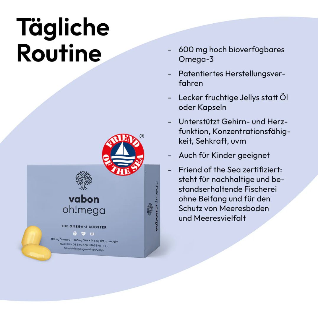 VABO-N OH!MEGA – THE OMEGA-3 BOOSTER ist dein Booster für deinen Omega-3-Haushalt mit höchster Bioverfügbarkeit kombiniert mit köstlichem Geschmack, den sogar Kinder lieben.