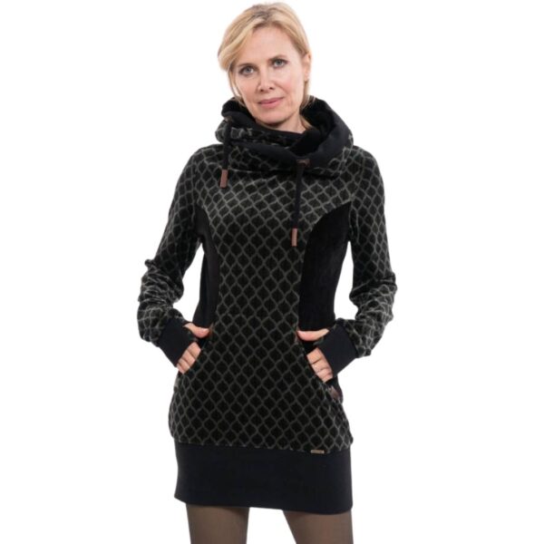 Die „Tunika Steffi“ – Olive Leaf ist leicht tailliert, hat eine 2 in 1- Kapuze mit Kordel (wandelbar zum Rollkragen),