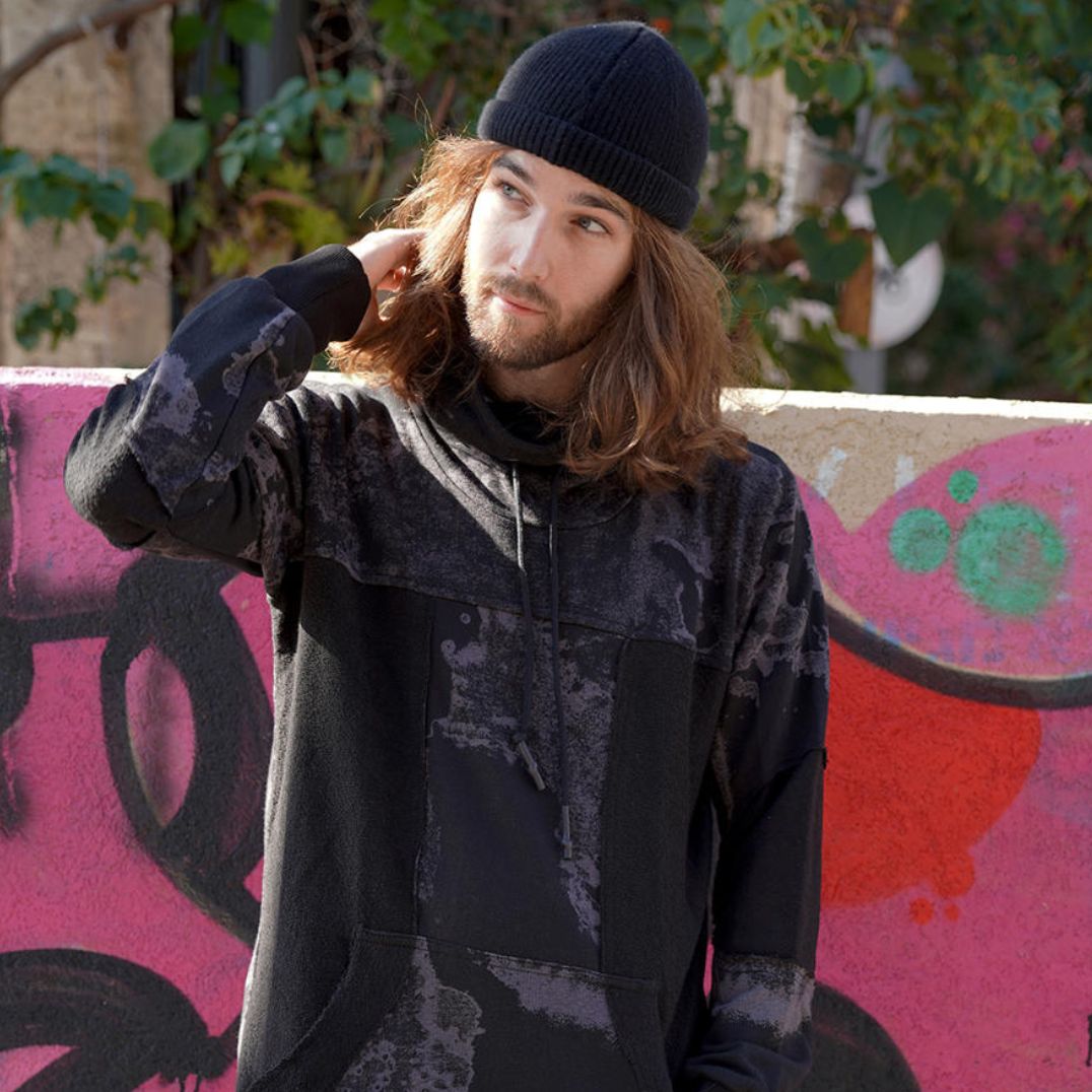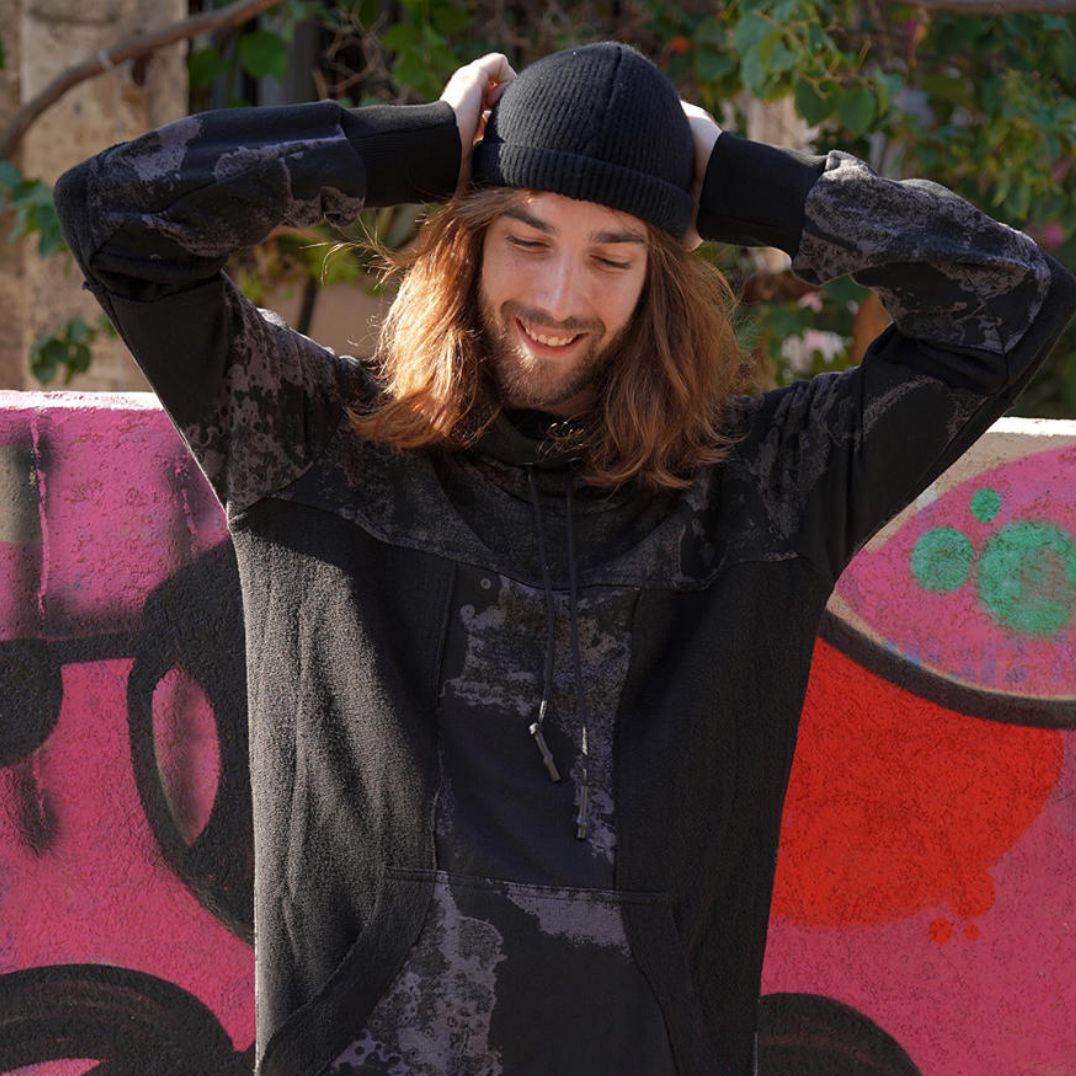 Pullover „Val Ho“ Black Texture – je besser man das Leben versteht, desto mehr erkennt man, dass Einfachheit meist die größte Eleganz mit sich bringt. Manchmal gibt es Stoffe, die für sich selbst sprechen und einem das Gefühl geben, genau richtig zu sein, zentriert und schlicht. Das Sweatshirt „Val” hat einen weiten Kragen mit Kordeln, die man bei Kälte enger ziehen kann – im Grunde genommen ist es also ein schöner dicker Schal. Eine große Fronttasche wärmt die kalten Arme und natürlich sorgt eine feine Stoffnaht für den einzigartigen Look dieses Sweatshirts.