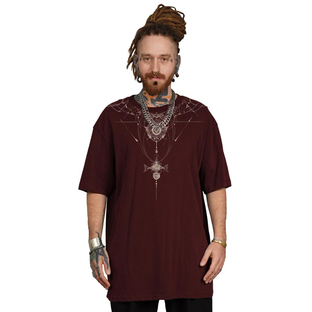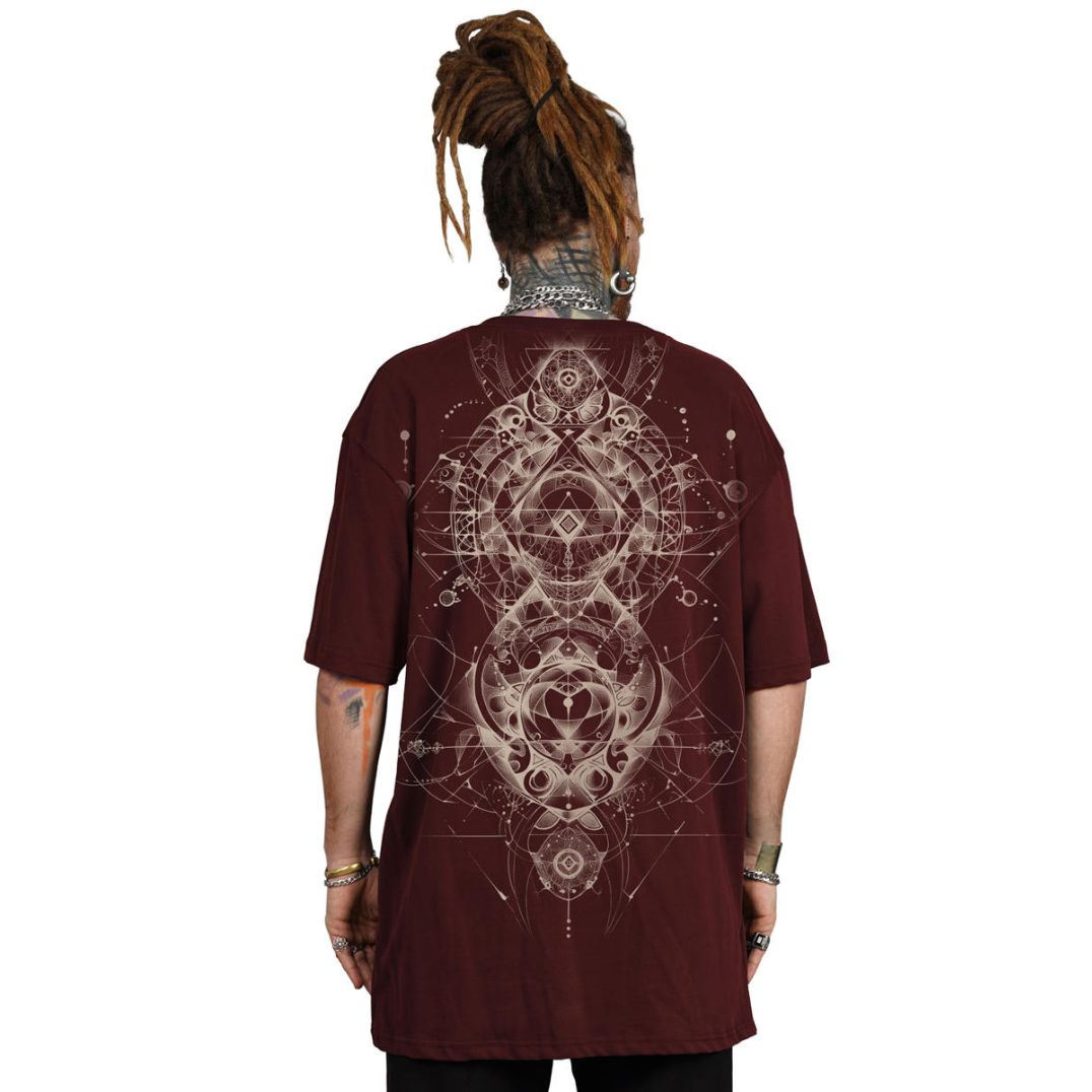 Das Shirt Oversize „Ornament“ Bordeaux ist ein visuell fesselndes, übergroßes Drop-Shoulder-Teil, welches ein originelles, psychedelisch inspiriertes Artwork präsentiert. ieses Shirt ist perfekt für alle, die sowohl alternative Mode als auch kreativen Selbstausdruck schätzen, und eignet sich daher ideal für Festivals oder den Alltag auf der Straße.