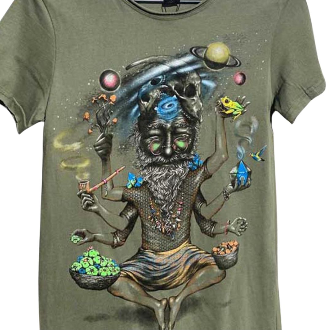 Schau dir diesen besonderen Baba genauer an, der alle Wunder der psychedelischen Welt in seinen Händen hält und dir dabei helfen wird, dein drittes Auge für einzigartige Visionen und eine bessere Welt zu öffnen.