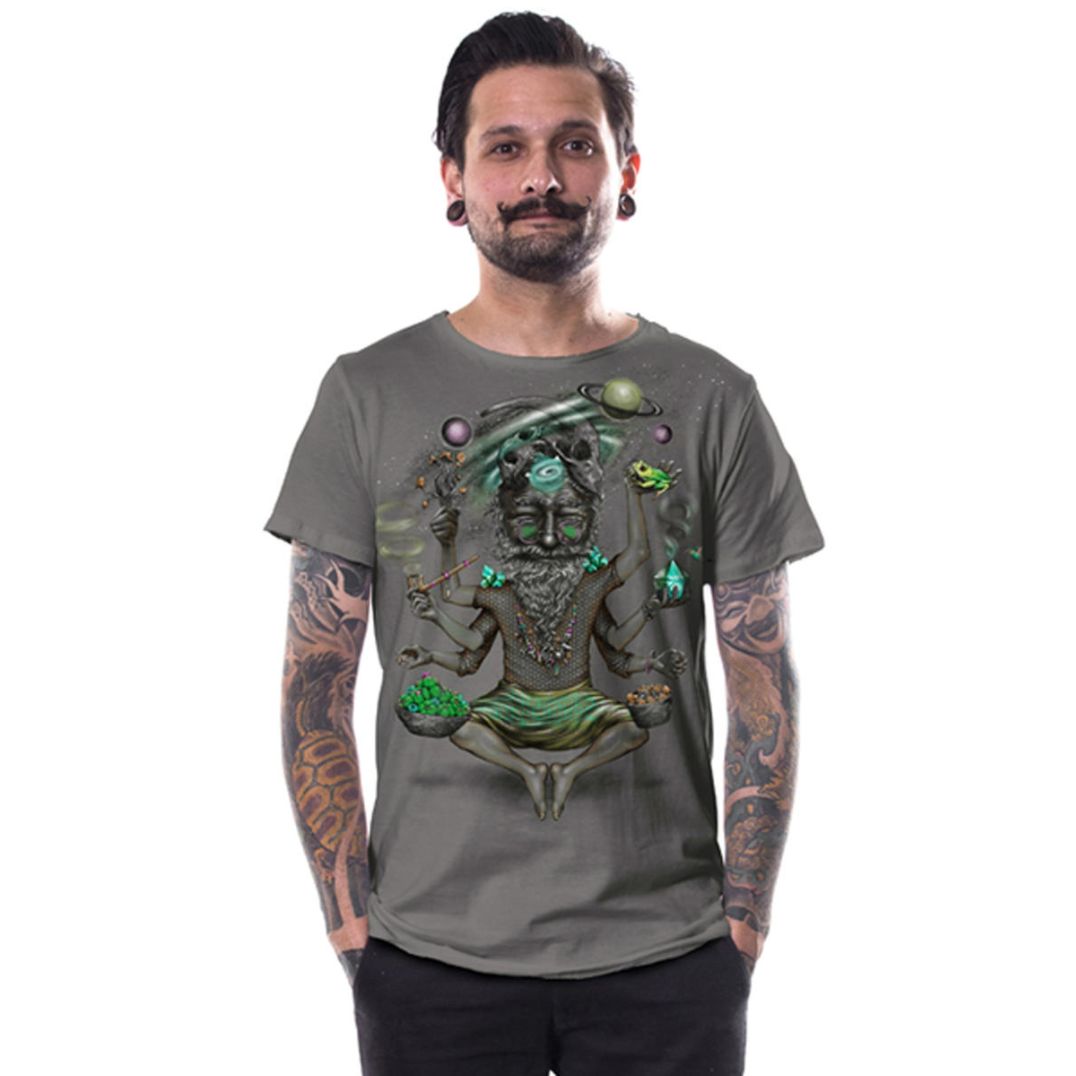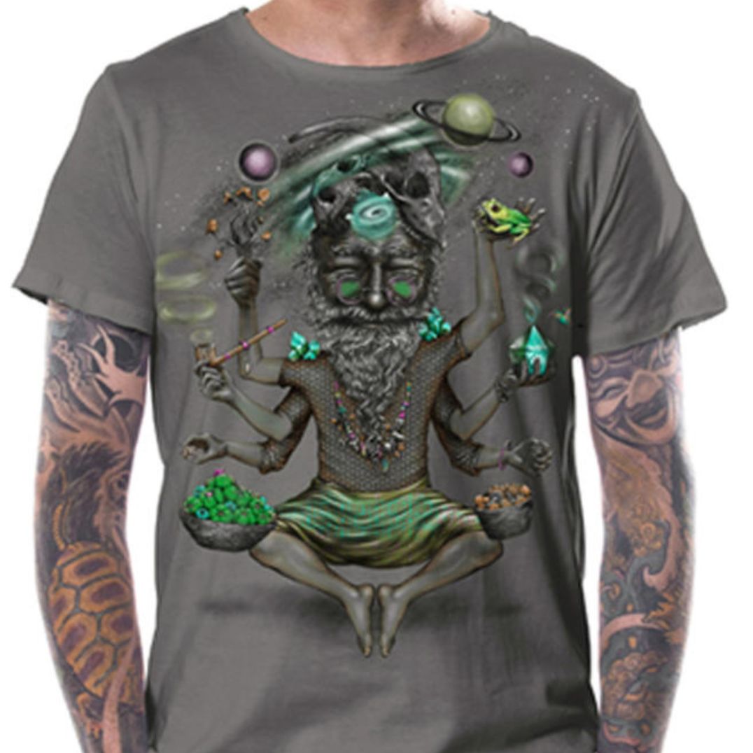Schau dir diesen besonderen Baba genauer an, der alle Wunder der psychedelischen Welt in seinen Händen hält und dir dabei helfen wird, dein drittes Auge für einzigartige Visionen und eine bessere Welt zu öffnen.