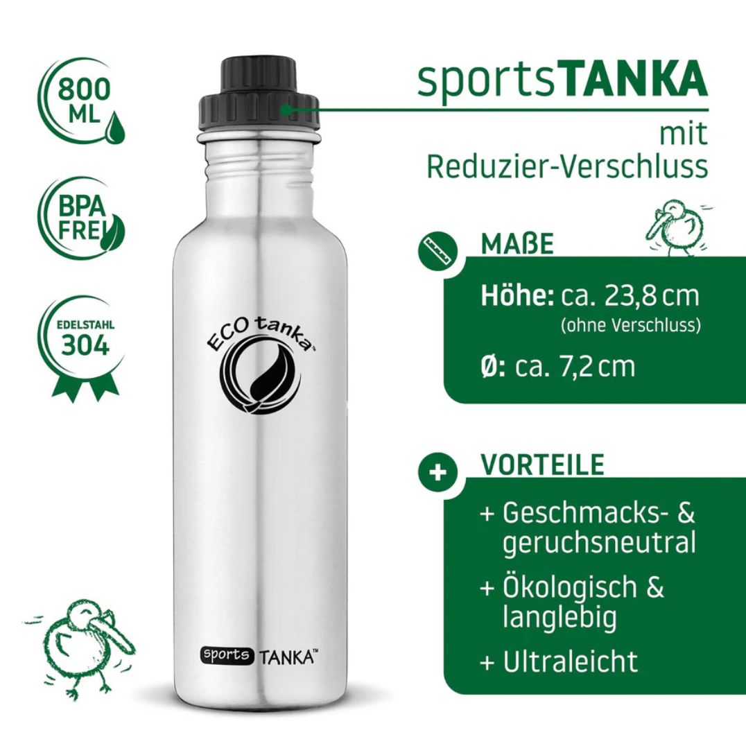 • sportsTANKA™ 0,8l Standard von ECOtanka™ – diese Trinkflasche aus reinem Edelstahl ist mit einem Füllvolumen von 800ml ideal für alle die gerne Sport treiben. Verschluss bitte extra bestellen!