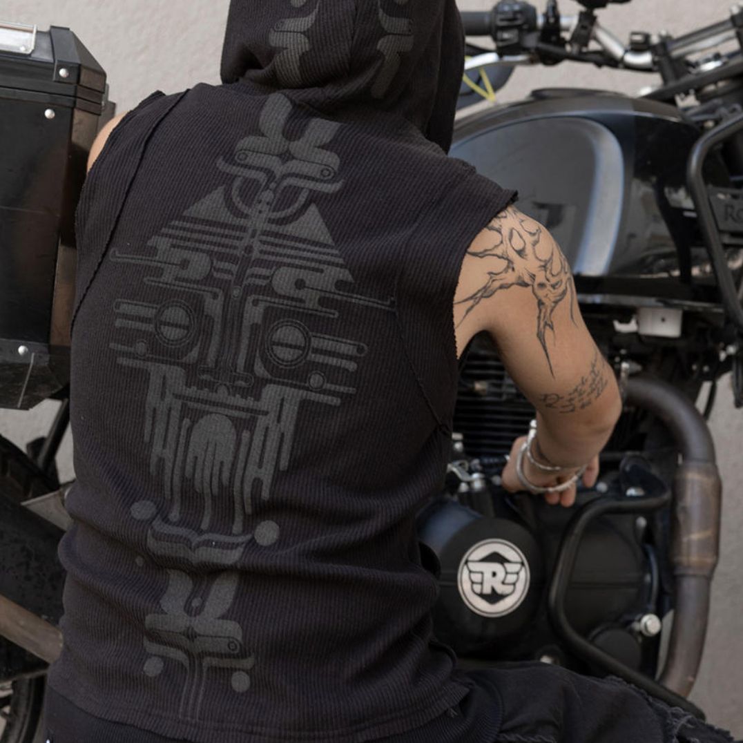 Das Design dieser Weste ist inspiriert von den komplexen Formen und Mustern der tibetischen Kunst, neu interpretiert durch die Linse moderner Linienkunst.